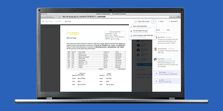 Sign Documents in Box with Adobe Sign: Now users will be able to review documents in Box and route them for electronic signatures in Adobe Sign. With content management and collaboration from Box, people can easily manage revisions, secure signatures, track approvals and distribute the final version of any form or contract. This can be done all in the cloud and without ever leaving the browser, making the process more secure and streamlined than ever. Available soon, the new integration between Box and Adobe Sign will eliminate the need to ever download, print and scan documents that require signature, use email to share the latest versions, or manually circulate documents between multiple parties for signature or approval.