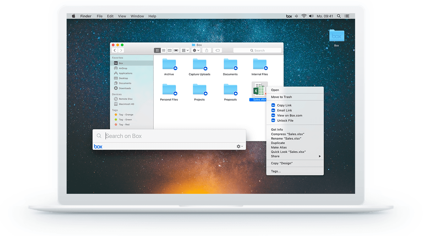 - Work in the cloud like you work on your desktop. Use Windows Explorer or Mac Finder to seamlessly find, create, access, and edit Box files right from the desktop. Changes automatically save back to Box.
