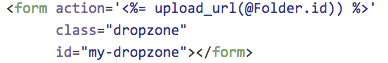 Step 2: Create a form element and give it the class of 'dropzone'. Dropzone will recognize the form and upload files that are dragged onto it to the 'action' attribute URL of your choosing. In the form below we are uploading files to the upload_url route that we created and including a destination folder in Box.