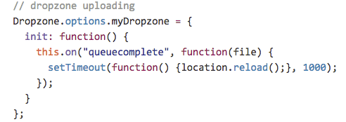 Bonus: Steps 1 and 2 will add a drop area to your page and pass uploaded files to a route of your choosing. If you would like to have a little more control, Dropzone.js includes plenty of options for customization. There is a full list in the Configuration section of their website. In the code below we register an event to reload the page when a timeout occurs.