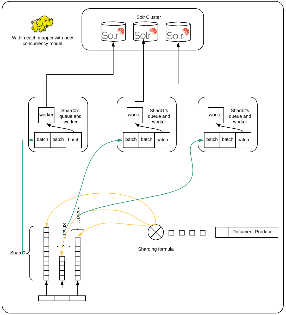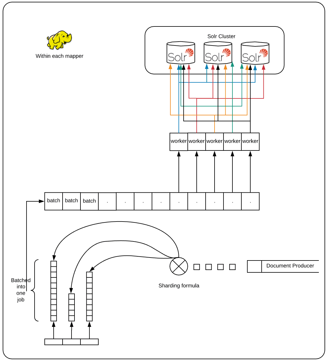 Within each mapper, there is a shared queue of batched jobs; and a shared pool of http clients which take a job from the queue and send it to the respective shard. Each individual document is not directly inserted into the queue. Rather, documents which need to be indexed on the same shard are batched together before inserting in the queue (current default is 10). The queue is bounded and when it is full then the document producer has to wait before scanning more rows.