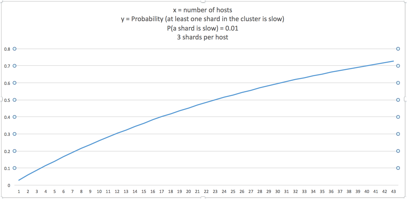 If we assume that for a given time interval p = 0.01, here is the chart for P(at least one shard in the cluster is slow):