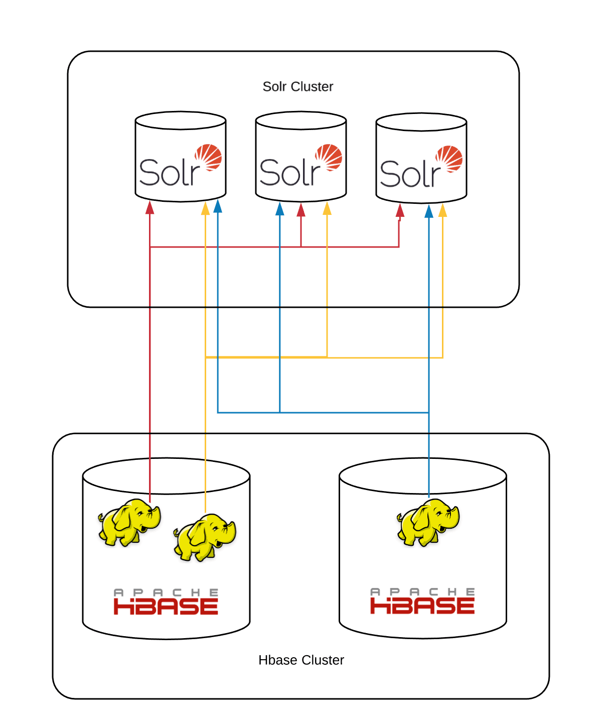 We shard our indexed documents based on the id, and the same document id is also used as the key the in hbase table. Our Solr sharding formula is id % number_of_shards. A mapreduce job scans the hbase table, computes the destination shard of each file by the above sharding formula and inserts each document in the corresponding solr shard. Here is a schematic diagram of the initial model which has served us well for the past few years: